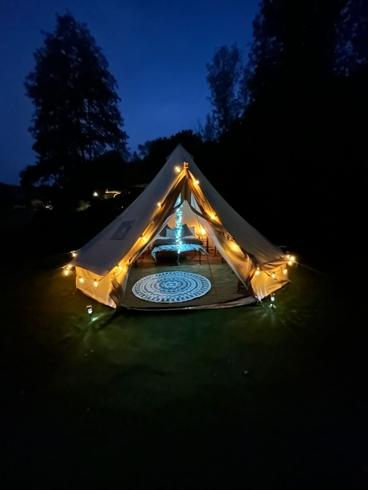 The bell tent is the chance to stay under canvas and no need to fiddle with a tent peg or argue about putting the tent up yourself! Our bell tent is a great option for being close to the stars but still staying warm and dry.