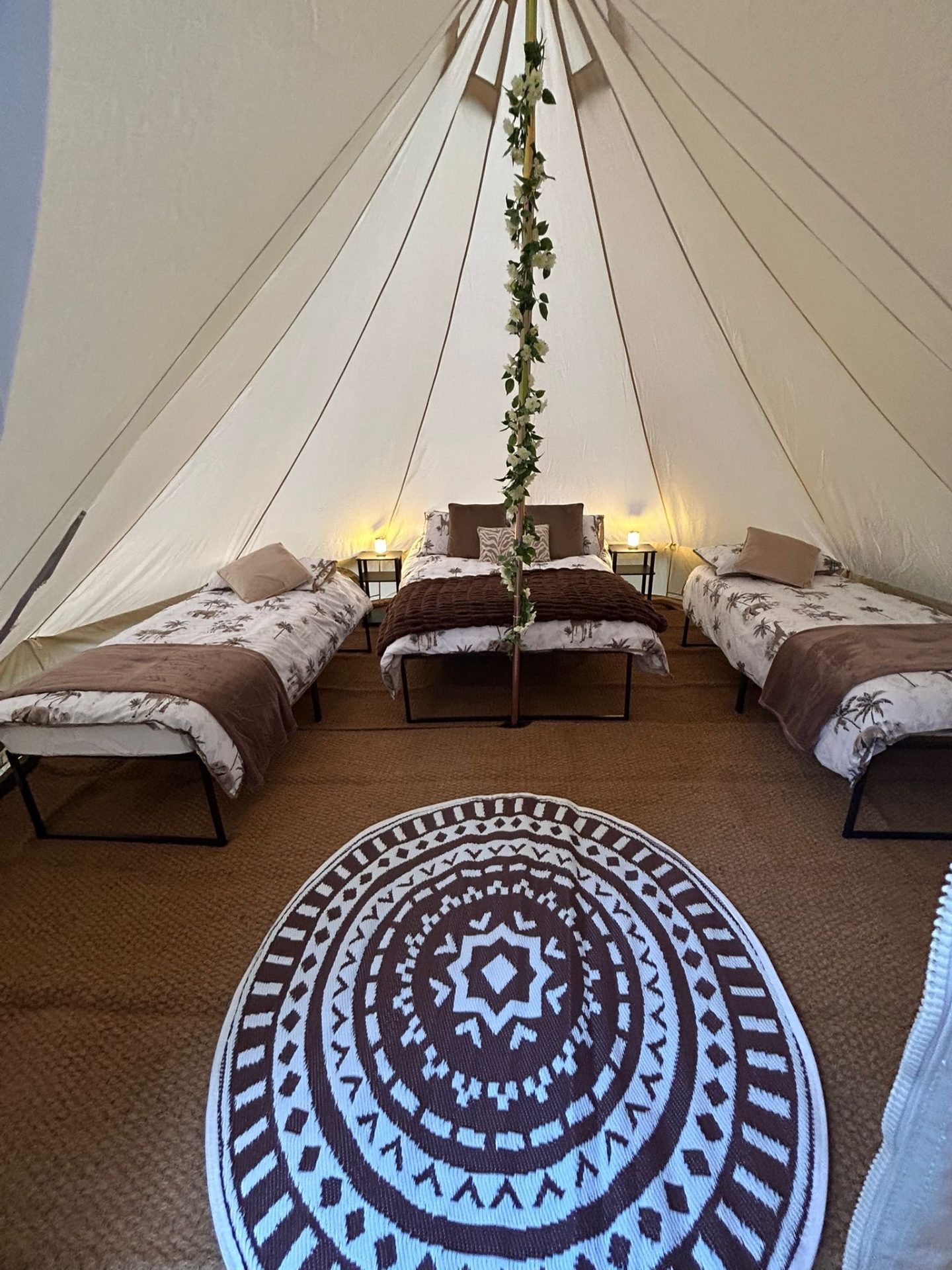 The bell tent sleeps 4 people (1 double bed and 2 singles). A birthday package consisting of homemade cake, bottle of wine and helium balloon available at the extra cost of ยฃ20 when requested*. Itโs available to book now, with a minimum of a 2 night stay at weekends, and 1 night stay in the week. Sorry no pets allowed.