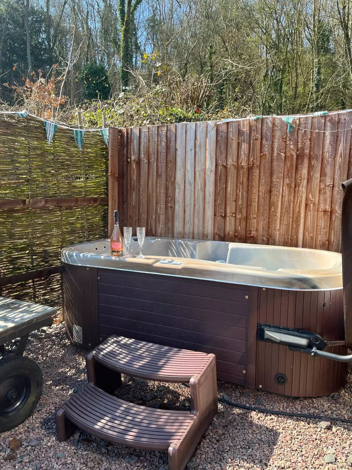 Whilst sitting by the fire pit at night enjoying a glass of wine, you can watch the stars come out and listen to the owls tooting. Firewood available to purchase at ยฃ5 per bag. This truly is a unique experience. The Railway hut has a private hot tub, towels are provided.